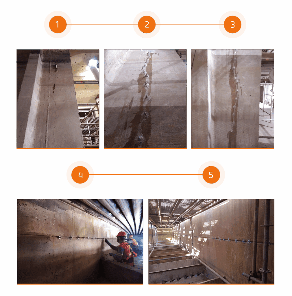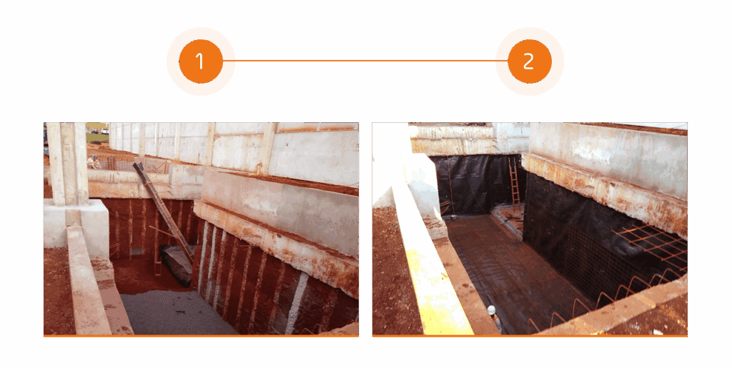 Neles, especificamos reforços estruturais, combinados com injeções de gel poliuretano.