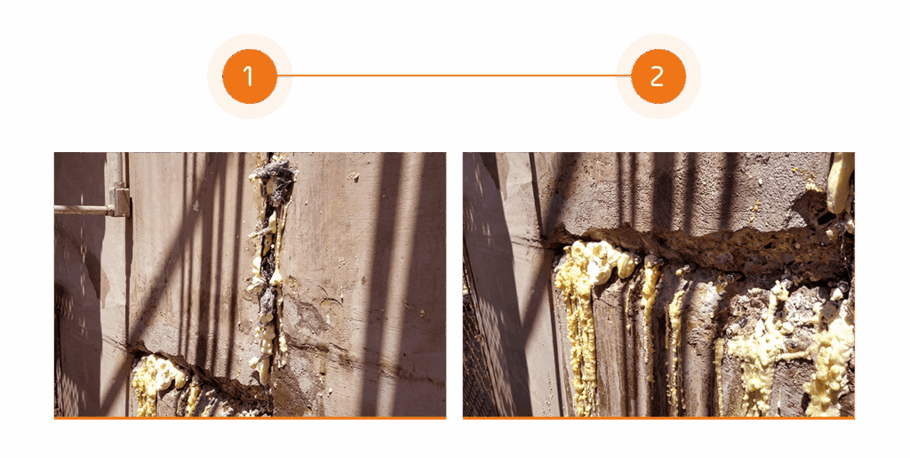 Em estruturas estáveis, com fissuração, realizamos a injeção de gel poliuretano sobre as aberturas.