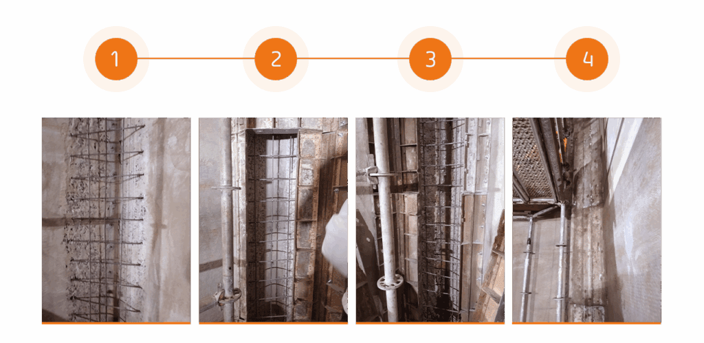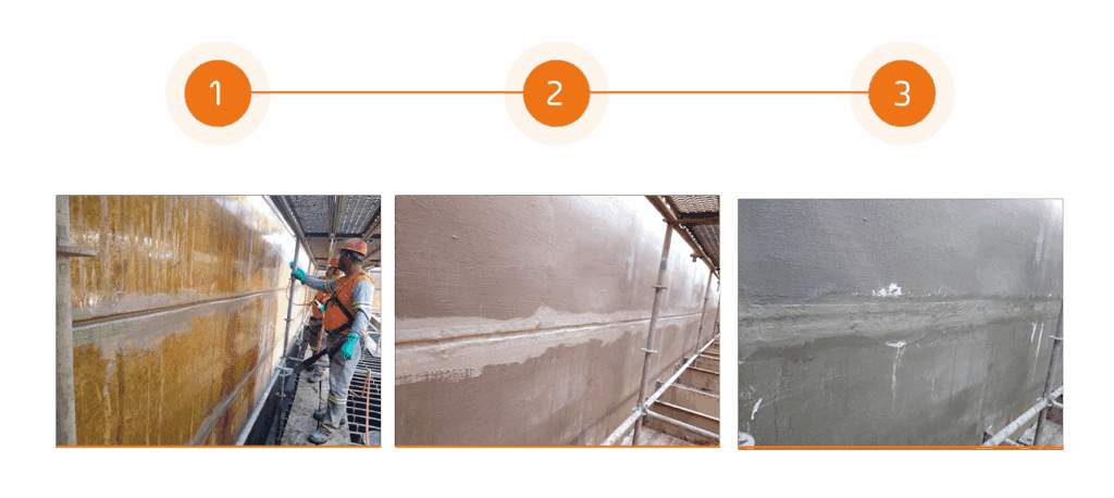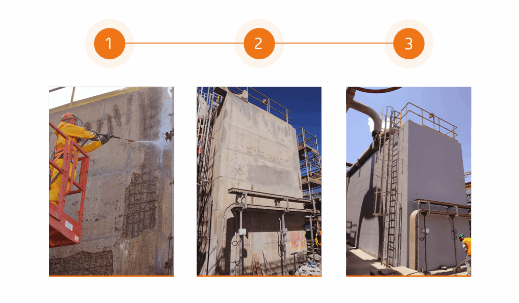 Nestes casos, a JR Monteiro faz a demarcação das áreas, delimitação por cortes, demolição, preparação das armaduras por jateamento abrasivo ou hidrojateamento, aplicação de pintura catódica sobre as armaduras, finalizando com a reconstituição do elemento concreto utilizando argamassas especiais, com resistências iniciais de 35 MPA e finais de 60 MPA.