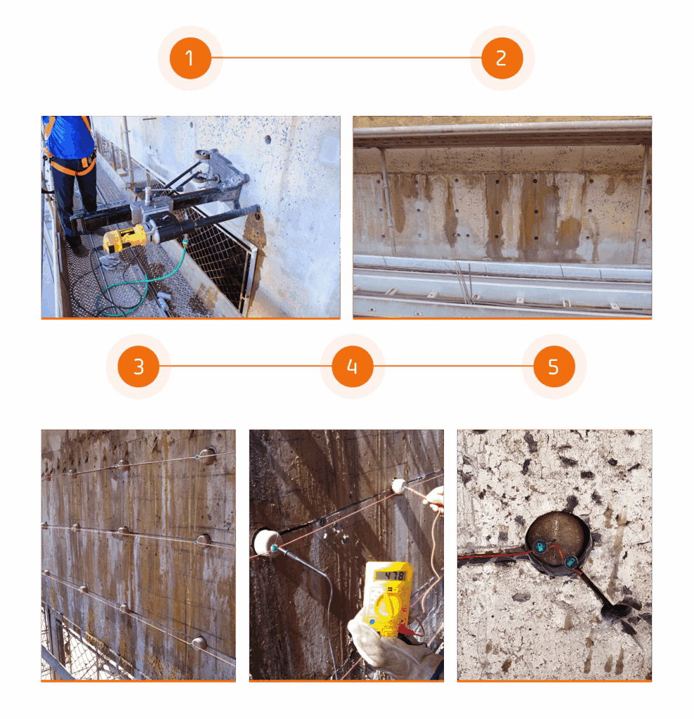 Identificando-se a perda da passivação, com a baixa resistividade dos concretos, temos as condições ideais para as instalações dos anodos de sacrifício.