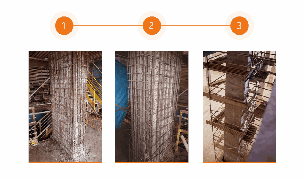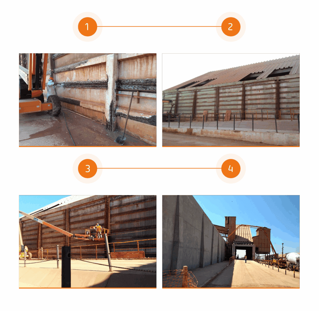 Recuperações convencionais, com recomposição pontual do elemento concreto, injeções de poliuretano em fissuras, instalação de fibra e lâminas de carbono, reconstrução com graute, reforços instalando armaduras complementares somados com super espessuras de concreto, substituição de elementos colapsados, são algumas das soluções já desenvolvidas em nossos projetos.