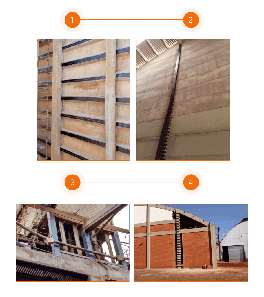 Elementos estruturais, que sofreram perda de bitola pela oxidação, ou que receberam cargas adicionais daquelas definidas em projeto, podem receber reforço e recuperação, utilizando as fibras e lâminas de carbono.