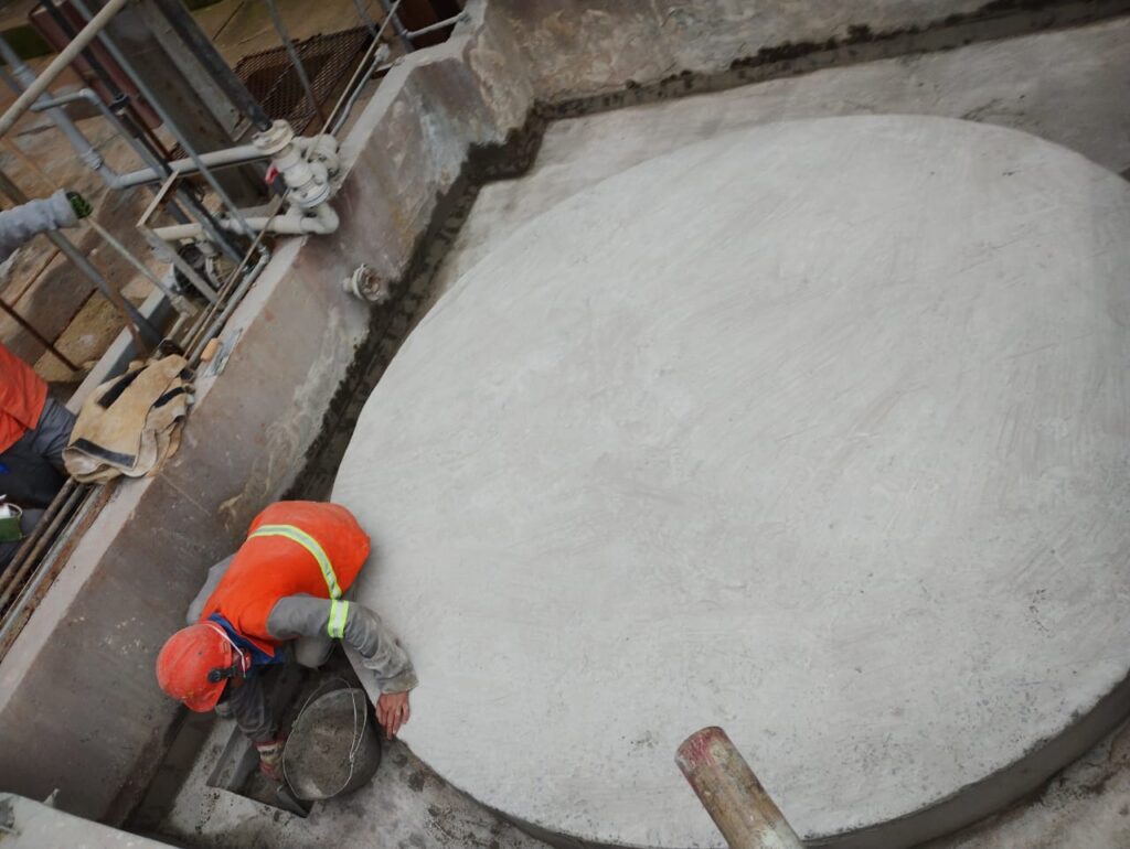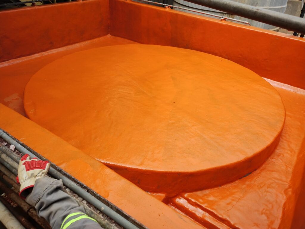 Temos em nossa rotina a análise, correções e construções para bases e diques de reservatórios de produtos químicos. Nesta obra, executamos a base e o dique de contenção para um reservatório de ácido sulfúrico com características químicas em pH 01. Inicialmente, realizamos um parecer técnico, constatando comprometimento estrutural severo, classificado como crítico emergencial, exigindo correções imediatas.