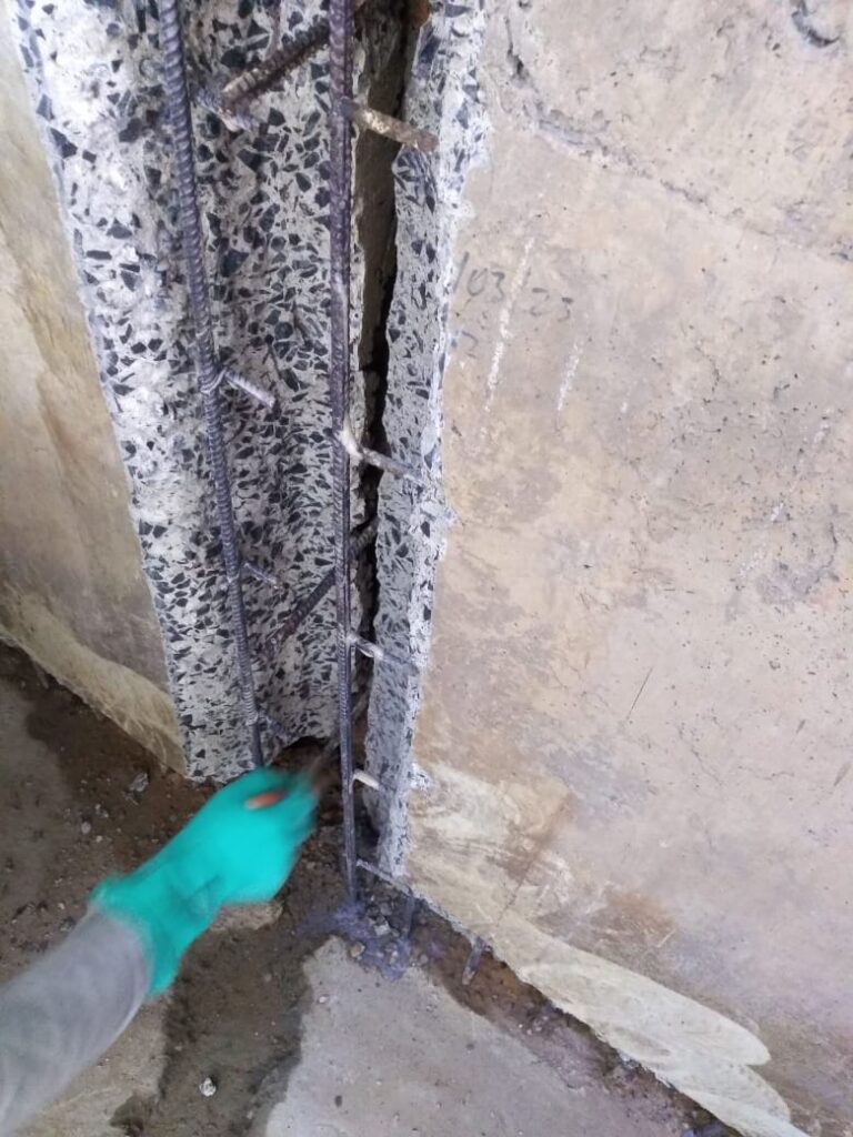 Nas recuperações do elemento concreto, naquilo que se refere aos lábios da junta, desenvolvimento de corte delineando as áreas a serem tratadas. Demolição dos concretos nestes espaços, seguido de hidrojateamento com 7.500 PSI, removendo elementos desplacados e sujidades, complementado com argamassa para recuperação estrutural com resistência final de 60 MPA.