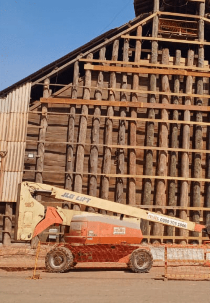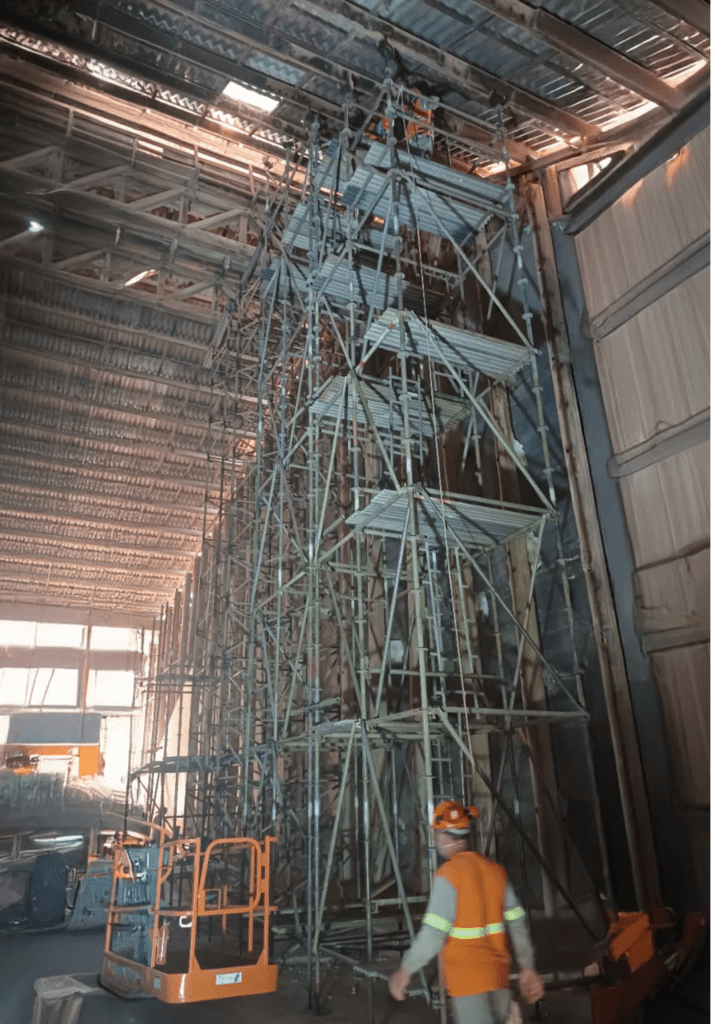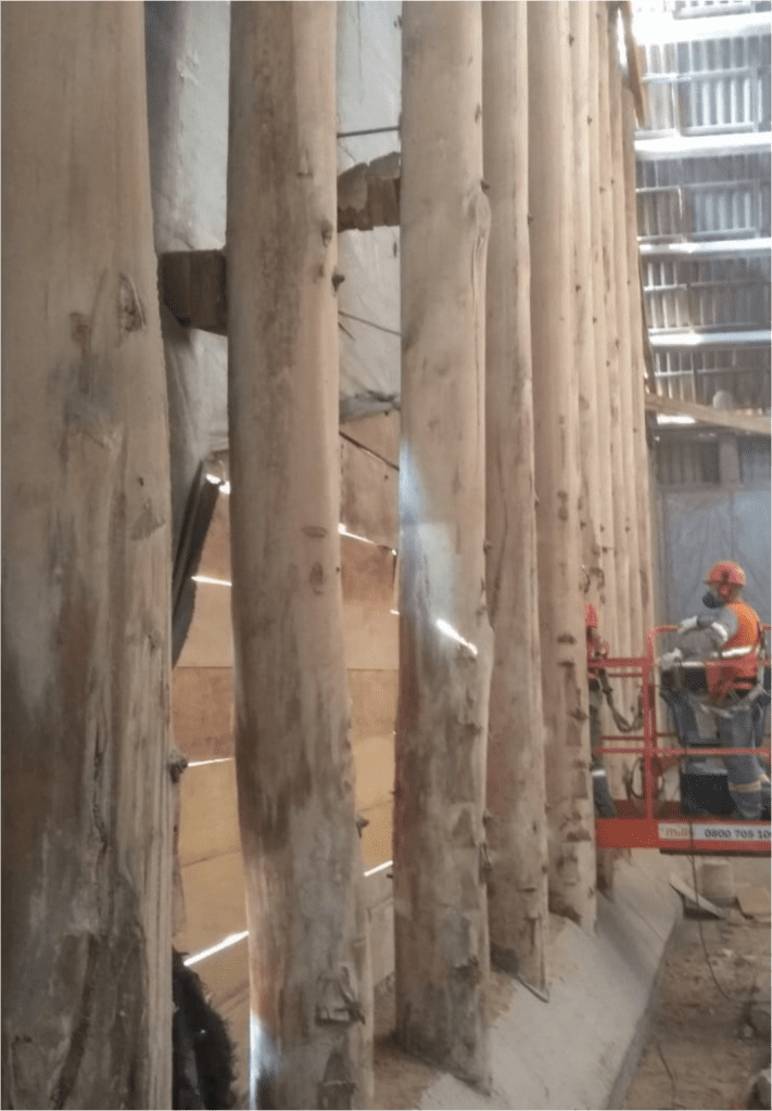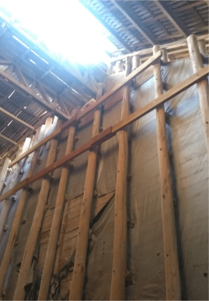 Como estas barreiras estavam em uma posição de extremidade no sistema de armazenagem, foi observada a necessidade do projeto com instalação de pórticos de estabilização, travando essas extremidades do sistema. Aqui também foram aplicadas madeiras de classificação C50 combinadas com elementos metálicos galvanizados.