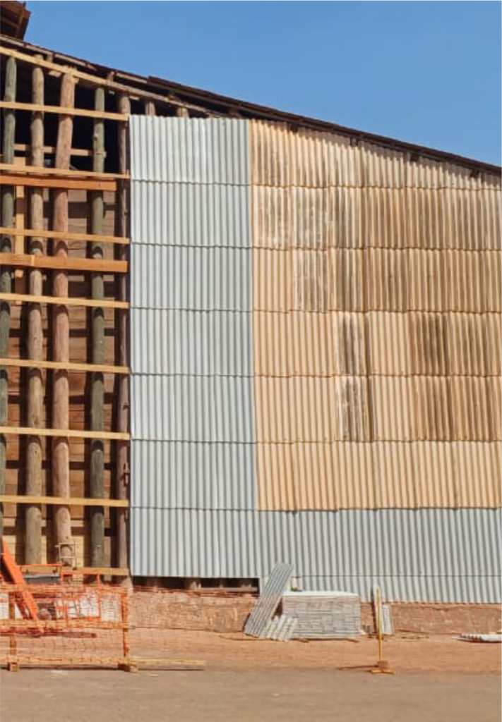 Alinhamento da cobertura, desenvolvendo projeto e extensões de ponta para esteios, utilizando madeira de classificação C50, também combinada com elementos metálicos protegidos por galvanização a fogo, assim como para viga de travamento longitudinal.