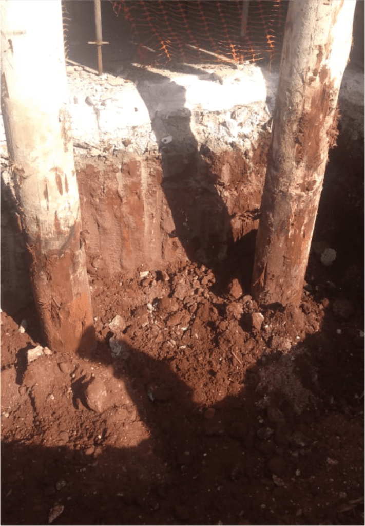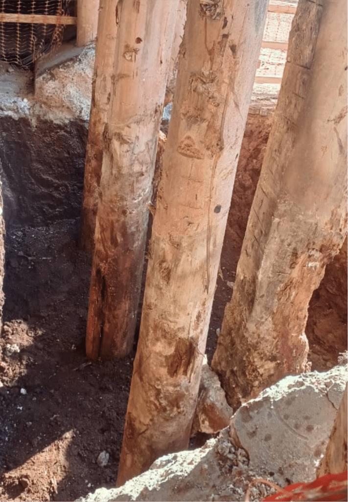 Substituição de esteios comprometidos, utilizando a espécie Citriodora com tratamento, combinado com elementos de ligação metálicos, protegidos por galvanização a fogo, construindo fundação e realizando o realinhamento dos pilares complementares.