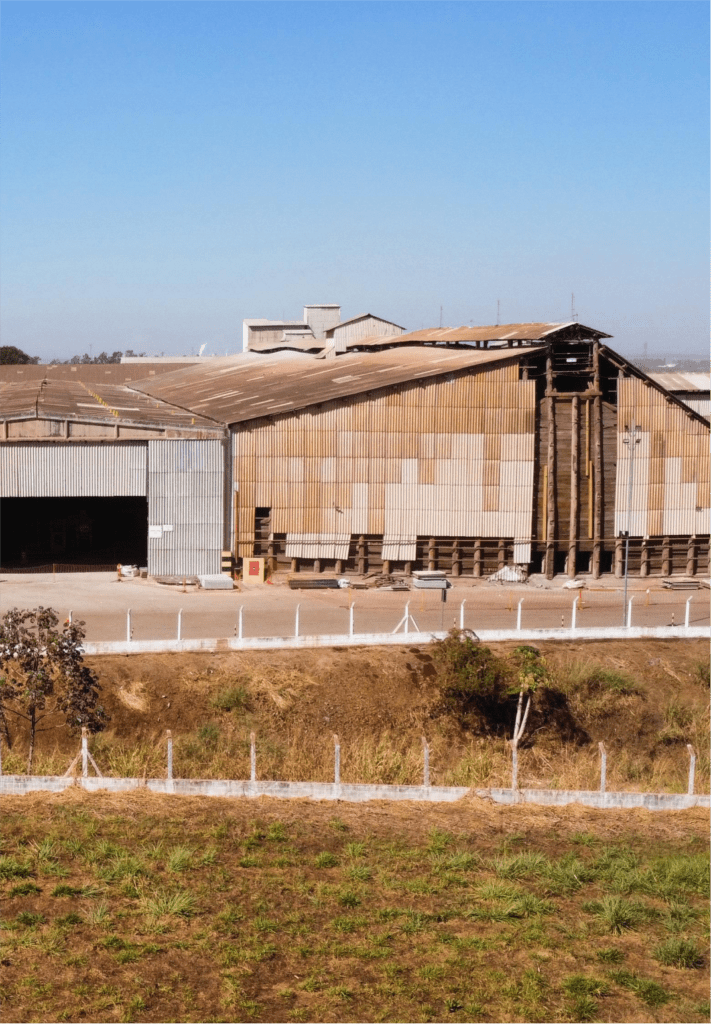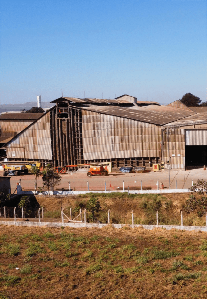 Recuperação de Sistema estrutural em Madeira combinando função de divisórias de box para fertilizantes, suportação correia e estrutura da cobertura