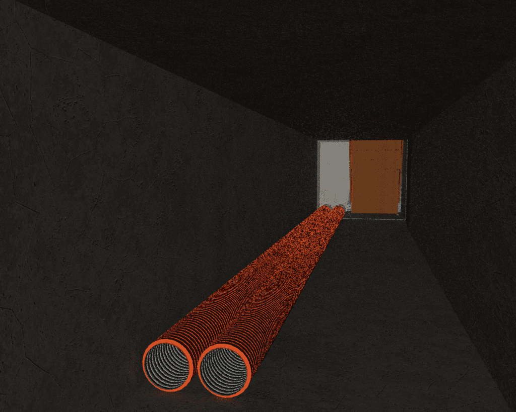 Nesses desenvolvimentos, preparando as áreas classificadas como de espaço confinado, iniciamos com as instalações das tubulações insufladoras de ar, combinadas com as instalações de iluminação. Em continuidade, colocamos os dutos para os lançamentos de concreto.