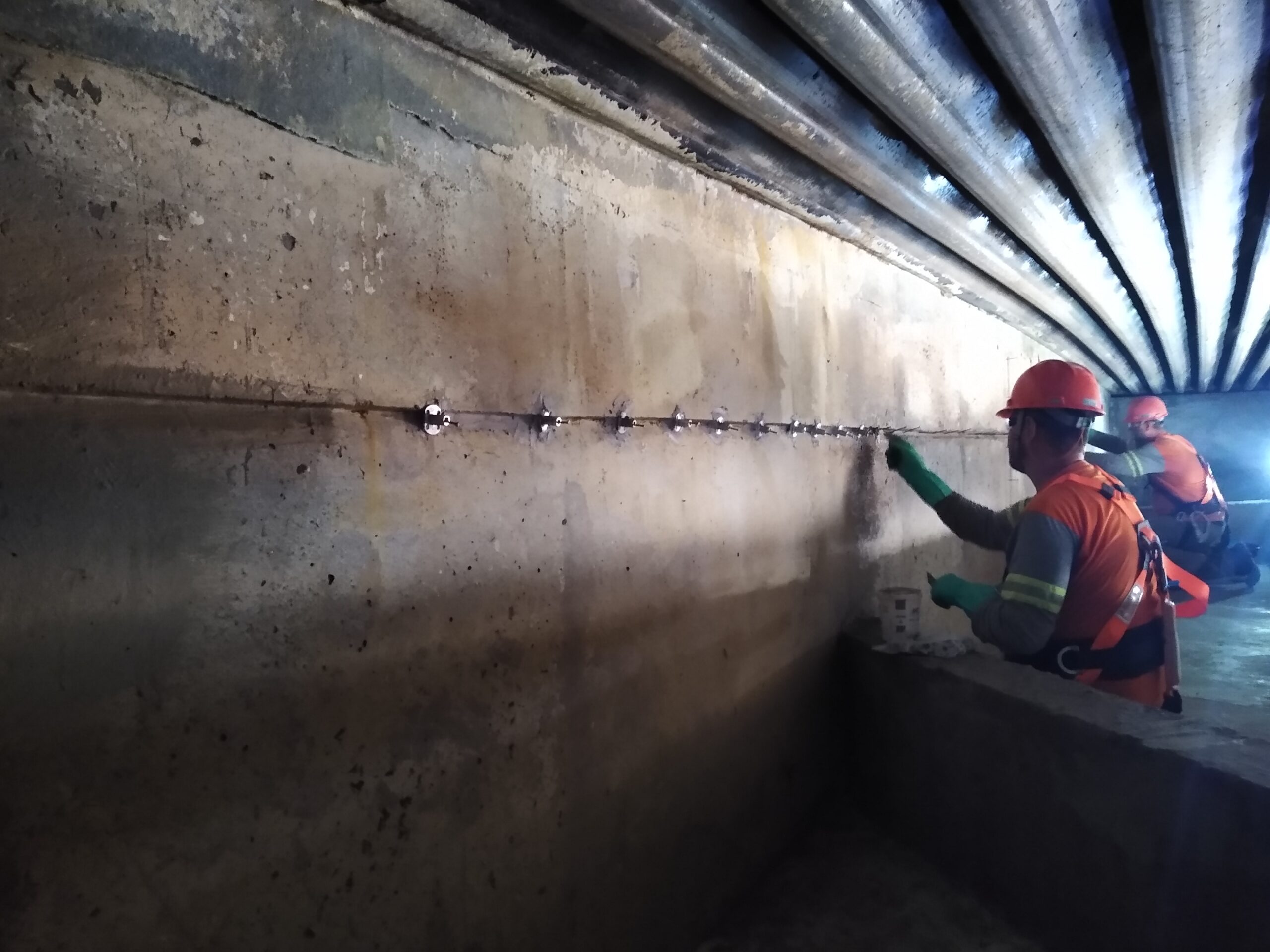 Em paralelo, iniciamos a instalação de arranques em armaduras nas paredes do túnel, utilizando chumbadores químicos nessas ancoragens.