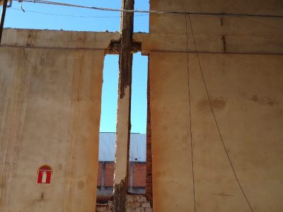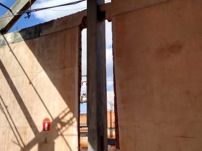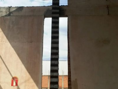 Nestes casos, iniciamos realizando aberturas nos fechamentos da edificação (tijolos), livrando o elemento estrutural (pilar) e permitindo a recomposição e reforço dos estribos, peças responsáveis pela contenção dos esforços de flambagem.
