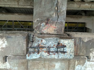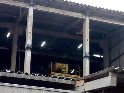Nos berços dos pilares, desenvolvemos projeto de recuperação estrutural, combinando a recomposição do elemento em concreto, utilizando argamassas com resistência final de 60 MPa, combinadas com as fibras de carbono.