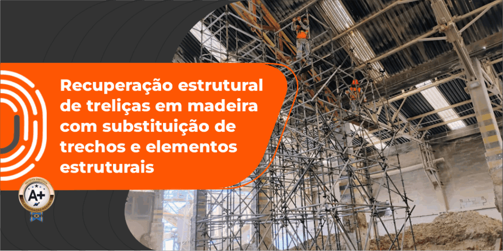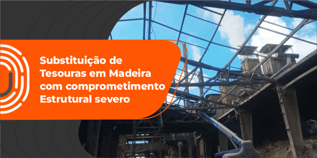 Em ambiente industrial com alta agressividade química, executamos a substituição de trechos e elementos de treliças em madeira com perda localizada de integridade.