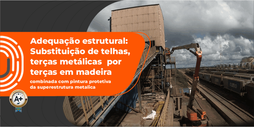 Em ambiente agressivo e sujeito à ação de fertilizantes, realizamos a substituição de terças metálicas por madeira, aliada a pintura protetiva epóxi sobre a estrutura existente.